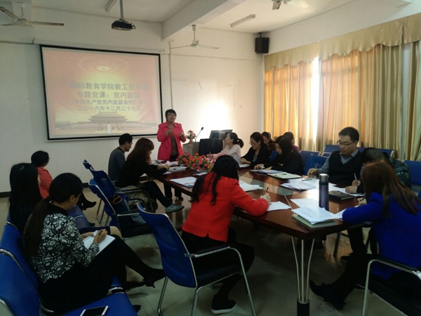 根据习近平总书记关于“两学一做”学习教育的重要指示、中央及海南省委、省教育工委“两学一做”学习教育工作会议精神,按照我校党委在全体党员中开展“两学一做”学习教育工作会议精神,12月27日下午,国际教育学院教工党支部召开全体党员大会,学习《中国共产党党内监督条例》。