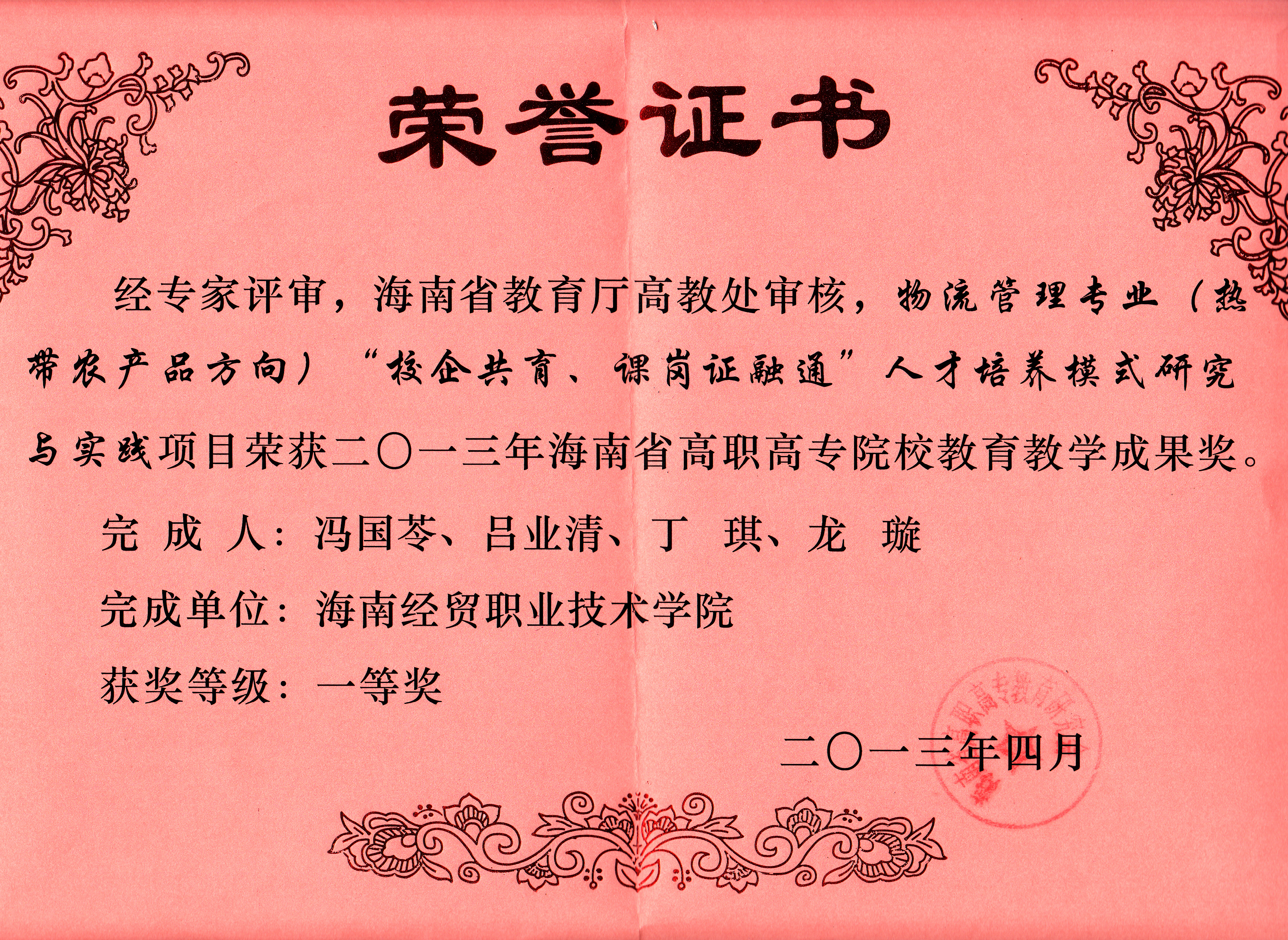2014年海南省高职院校技能竞赛工商管理系物流管理专业代表队荣获团体二等奖